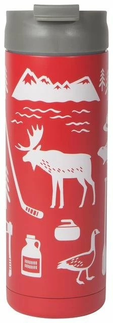 Take your drink on the go with this double walled stainless steel travel mug. Brimming with Canadiana charm, it can keep liquids hot for 6 hours or cold for 24 hours.