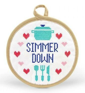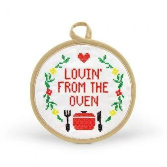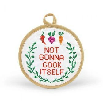 IN STITCHES pot holders are for the saucy, subversive chefs that like a little stitchin’ in their kitchen. Each design is embroidered with a cheeky cross stitch pattern on the front, and a grippy silicone pattern on the back. Design by Fred Studio, in cooperation with Subversive Cross Stitch.