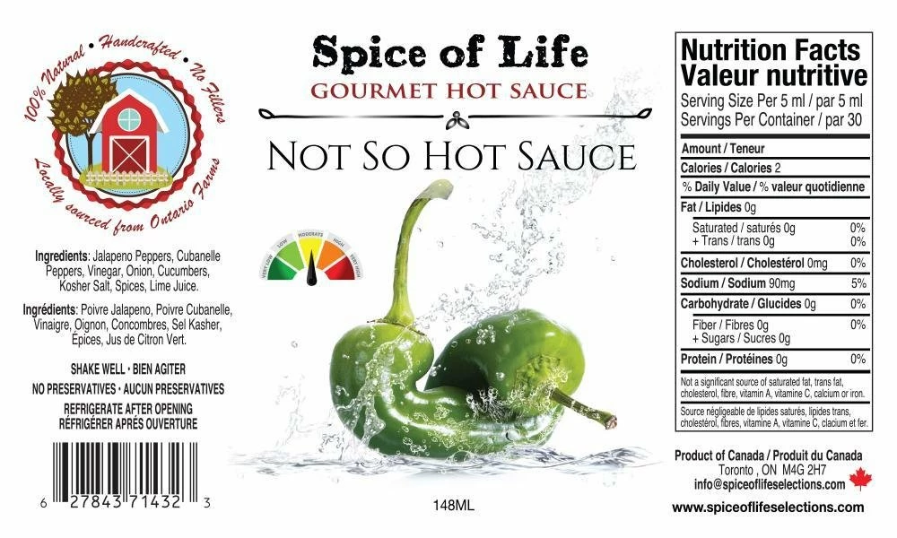Not So Hot Sauce, Spice of Life’s mildest sauce, is made with Jalapeno. You will find hints of lime in this flavor-forward sauce which pairs well with Mexican foods such as Tacos and Nachos, also great on Pizza and fantastic to use in a guacamole!
